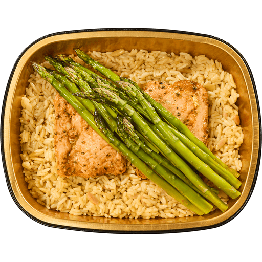 CONTAINS: Wheat,Fish (salmon) FOOD SAFETY: Keep refrigerated.493 HEATING: Oven-Remove lid and stickers, cover pan with foil that has been coated with cooking spray. Cook at 350°F for 30-40 minutes until the internal temperature reaches 165°F. Remove and let sit for 5 minutes. Microwave-Remove lid and stickers, cook 3-4 minutes until the internal temperature reaches 165°F. Remove and let sit for 5 minutes.Produced in a facility that also processes Soy, Wheat, Milk, Eggs, Tree Nuts, Peanuts, Sesame, Fish, and Shellfish.
