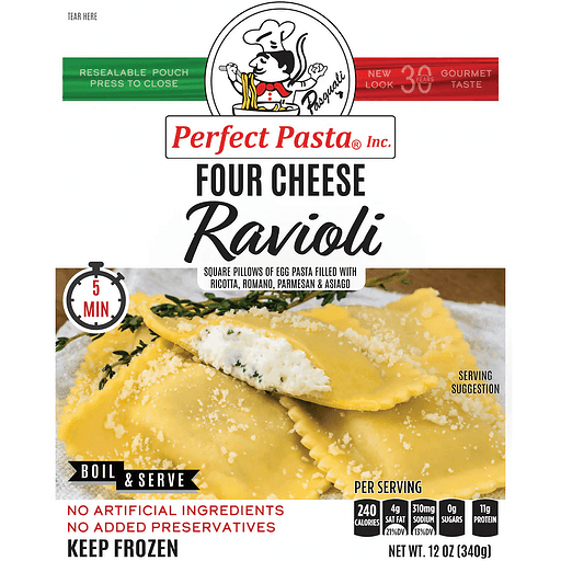 Square pillow of egg pasta filled with ricotta, romano, parmesan & asiago. No artificial ingredients. No added preservatives. Per Serving: 240 calories; 4 sat fat (21% DV); 310 mg sodium (13% DV); 0 g sugars; 11 g protein. Boil & serve. New look 30 years gourmet taste. Resealable pouch. At Perfect Pasta, your table is our table! For over 30 years, our focus has been and always will be family. Our Goal Is Simple: We aim to always produce the highest quality delicious & innovative gourmet pastas, using the finest ingredients, so you can spend less time in the kitchen, and more time sharing a homestyle meal with the ones you love. For a delicious recipe idea, scan this code with your phone or smart device! To see more of our products and recipes, go to www.perfectpastainc.com. Facebook. Instagram. Twitter. Pinterest.