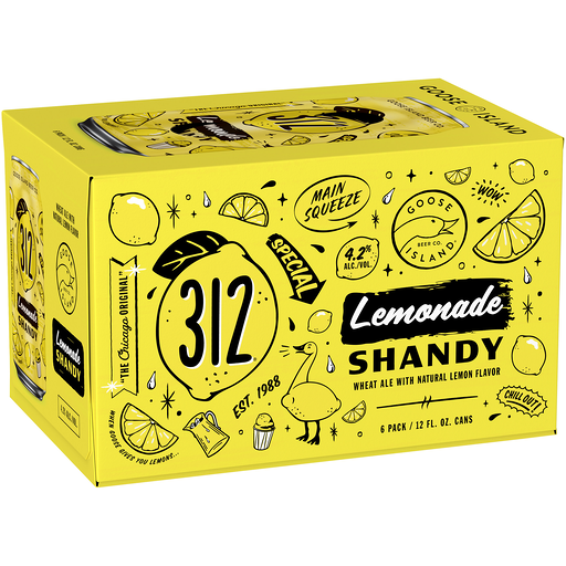 Goose Island 312 Lemonade Shandy Beer, 6 Pack 12 fl. oz. Cans, 4.2% alcohol by volume, Craft Beer. Expect a bright lemon flavor along with slight sweetness, balanced by crisp lemon acidity. Easy drinking and session-able, 312 Lemonade Shandy is sure to hit the spot, no matter if the stand is open or not. Goose Island Craft Beer is a Chicago Original. Enjoy responsibly.