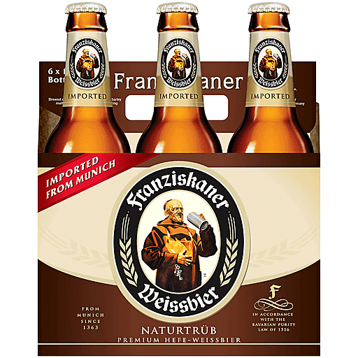1-800-342-5283 5 Franziskaner Hefe-Weissbier is an elegant Weissbier from Bavaria with a lush white foam. The copper golden wheat beer unfolds with an aromatic fragrance and harmonious banana and citrus fruits.