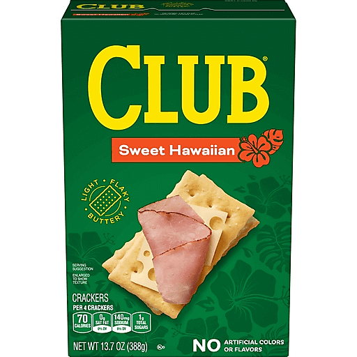 When it's time for close friends and really good snacks, a Club is all you need. Club Sweet Hawaiian brings the flavor of everyone's favorite dinner roll into a buttery cracker with a hint of sweetness. A balance of richness and a hint of salt and sweet, they pair perfectly with toppings like meats, cheese, and fruit or can transform your go-to slider recipe into bite-sized treats; they're an easy win made with no artificial colors or flavors. Club Sweet Hawaiian crackers are a fun snack for everyone. Create a moment with your crew at your next get together with a charcuterie board or bring a box to your next game night. It’s no fuss, just friends and really tasty snacks. Put together a cracker platter and share with your closest besties. Club crackers bring buttery goodness in every comforting, easy-to-love cracker.