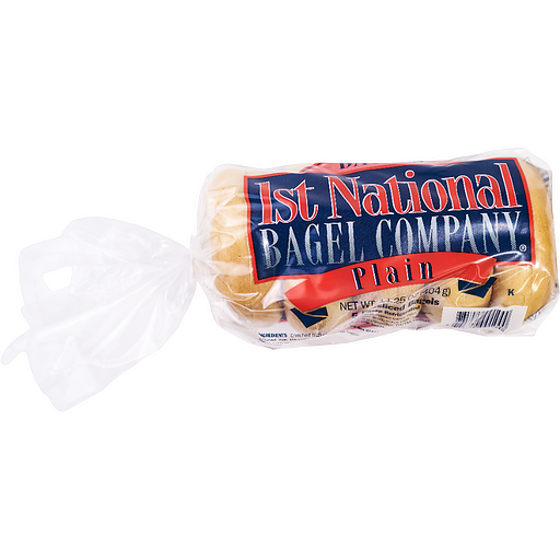5 pre-sliced bagels. According to the dictionary, bagels are hard, glazed, doughnut-shaped rolls. Bagels may be doughnut-shaped but that is where the similarity ends. 1st National Bagels are a chewy, crusty, low-fat and healthy alternative to bread that will delight your taste buds. In fact, try using our bagels any time instead of bread. In bagels we trust! With 1st National Bagels, you can let your imagination run wild. Try them for breakfast, lunch, dinner, or in between. Prepared in any way, our bagels will always deliver a delightful taste sensation.