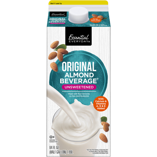 Per 1 Cup Serving: 30 calories; 0 g sat fat (1% DV); 170 sodium (7% DV); 0 g total sugars. Lactose free & Soy free. Gluten free. 50% more calcium than dairy milk (1 cup of 2% milkfat dairy milk contains 290 mg (20% DV) calcium vs. 1 cup of Essential Everyday unsweetened almond milk contains 450 mg (35% DV) calcium. Milk (01079) data from USDA National Nutrient Database for standard reference release legacy April, 2018). With calcium & vitamins A, D & E added. Made with real almonds. Ultra-pasteurized. Great products at a price you'll love-that's essential everyday. Our goal is to provide the products your family wants, at a substantial savings versus comparable brands. We're so confident that you'll love essential everyday, we stand behind our products with a 100% satisfaction guarantee. essentialeveryday.com. Pure-pak. Elopak.