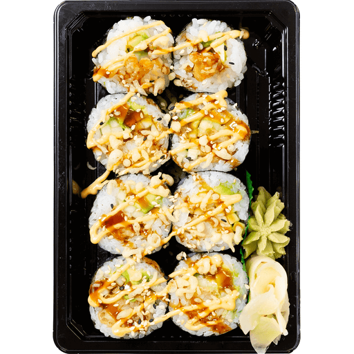 A popular choice in sushi, this roll is a supersized futomaki roll, rolled in the traditional style with the nori on the outside. Featuring crunchy tempura shrimp, capelin roe, creamy avocado and cool cucumber, this roll is sure to satisfy even the biggest appetites.