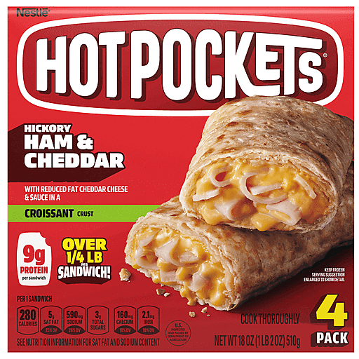 Dive into the cheesy, saucy and savory world of snacking with Hot Pockets Hickory Ham and Cheese in a croissant crust 4 PK. This box comes with 4 frozen sandwiches, so you can share with friends and family or save some for later. Each Hot Pockets sandwich is loaded with hickory ham, reduced fat cheddar cheese, and sauce, stuffed inside a croissant crust. These indulgent ham and cheese Hot Pockets aren’t your average frozen snack and are a satisfying upgrade from a ham and cheese sandwich. Hot Pockets frozen sandwiches are hunger’s worst nightmare, delivering the bold flavors of ham and cheese in a hearty microwaveable snack. Great for gaming all night, a convenient breakfast sandwich or a quick snack before heading out the door – a Hot Pockets Ham and Cheese sandwich is perfect for any occasion. These frozen sandwiches are a good source of protein with 9 grams per serving. Cook this microwave food for 1 minute, 50 seconds on high for a quick snack, or air fry at 360 degrees Fahrenheit for 14 minutes if you want a crispier crust. Keep your Hot Pockets Ham and Cheese sandwich frozen until ready to cook and eat.