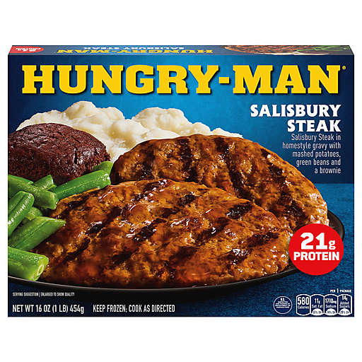 Enjoy classic home-style flavors and satisfy your comfort food cravings with Hungry-Man Salisbury Steak. Dig into an easy-to-prepare frozen meal featuring Salisbury steak in home-style mushroom and onion gravy, creamy mashed potatoes and green bean side dishes, and a rich chocolate brownie dessert. With 21 grams of protein per serving, this frozen food offers a home-style recipe for satisfying frozen entrees that are ready to eat anytime hunger strikes. Whether you're looking for convenient lunches to bring to work, a hearty TV dinner or easy meals that are ready to eat in minutes, Hungry-Man microwave meals are a great choice to tackle those tummy rumbles. Simply follow the instructions on the package to microwave or prepare these quick meals in a conventional oven. Each package contains one full meal that is perfect for busy lifestyles and hearty appetites. Store the convenient frozen meals in your freezer until you're ready to enjoy. Try other Hungry-Man frozen meals to find your favorite. Hungry-Man offers big portions for big appetites.