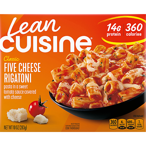 Satisfy your comfort food cravings with a Lean Cuisine Comfort Cravings Five Cheese Rigatoni Frozen Meal. At 360 calories and 14 grams of protein per package, this easy-to-make Lean Cuisine meal features freshly made rigatoni pasta topped with a five cheese blend in a sweet tomato sauce. Each 10-ounce frozen dinner can be enjoyed on its own or served with a side salad as part of an easy meal. Pair your Lean Cuisine frozen meal with a sandwich, or customize it with your favorite add-ons. This microwave meal is ready in less than seven minutes and makes a convenient lunch, dinner or snack. Lean Cuisine entrees are made with premium ingredients for a tasty, feel-good meal. This microwave meal contains no preservatives and offers 15% daily value of calcium per serving for a satisfying frozen dinner you can feel good about. Lean Cuisine frozen meals are not your mother’s diet food. Lean Cuisine helps you take control of your wellness goals with a variety of delicious frozen dinners and snacks, all 400 calories or less. For more crave-worthy meal options from Lean Cuisine, try Lean Cuisine Comfort Cravings Macaroni and Cheese or Lean Cuisine Comfort Cravings Lasagna With Meat Sauce.