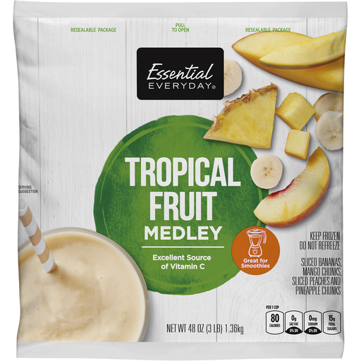 Sliced bananas, mango chunks, sliced peaches and pineapple chunks. Great for smoothies. Excellent source of vitamin C. Per 1 Cup: 80 calories; 0 g sat fat (0% DV); 0 mg sodium (0% DV); 15 g sugars. Reclosable package. Real savings. Highest quality. Every day. If you're not completely satisfied with this product, please contact us at www.essentialeveryday.com or 1-877-932-7948. Fruits & Veggies: more matters. Great products at a price you'll love - that's Essential Everyday. Our Essential Everyday frozen fruit is picked at the peak of freshness and quickly frozen to lock in all the goodness fruit has to offer. It's why we often say, we freeze the best! For recipes, visit www.essentialeveryday.com. Product of Colombia, Greece, Peru.