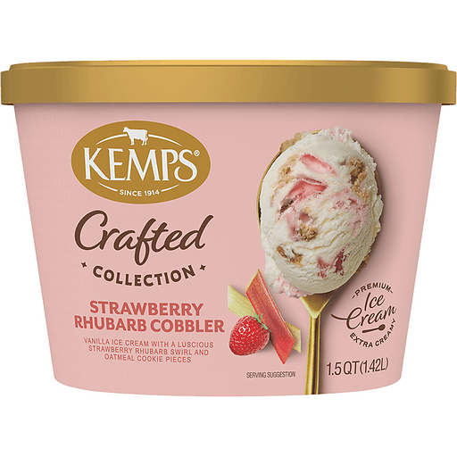 Ice cream lovers rejoice! Kemps Crafted Collection Strawberry Rhubarb Cobbler Ice Cream is crafted for pure indulgence. Churned with extra cream from family farms, Crafted Collection is our richest and creamiest ice cream yet. From the perfectly crafted traditional to the deliciously unexpected, there's a flavor for everyone. Enjoy this delicious ice cream by the scoop with a cone, in a bowl with all your favorite sundae toppings, or as a side with your favorite cake. Since 1914, Kemps has been delighting families throughout the upper Midwest with wholesome and delicious dairy products. Farmer owned. Family loved.