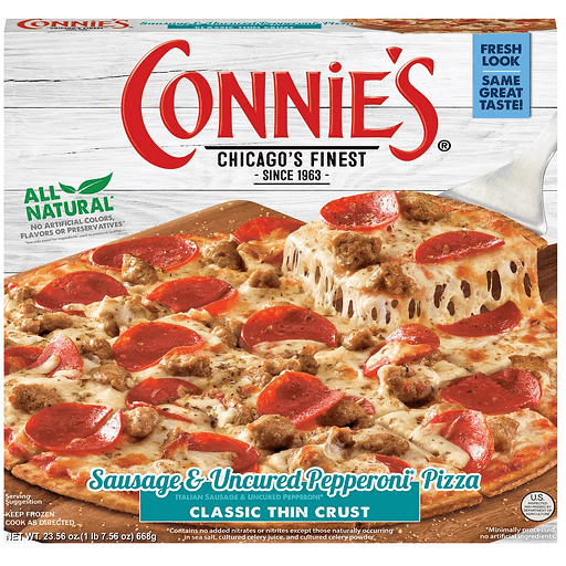 Sausage & Uncured Pepperoni (No added nitrates or nitrites except those naturally occurring in sea salt and celery juice powder). Est. 1963. Great taste from restaurant quality ingredients. All natural. Taste the Tradition! Our crust is light, tender and dusted with corn meal for an added depth of flavor. Our Signature Sauce is a family recipe that has been passed down for generations. We start with vine-ripened tomatoes, then add a blend of select herbs to create a smooth, flavorful sauce. Our Premium Quality Toppings are a delicious combination of oven roasted green peppers, onions, mushrooms and savory pork Italian sausage that is topped with our signature cheese blend of creamy 10% real mozzarella, Parmesan and Romano cheeses. The Connie's StoryAlways experimenting, never satisfied - these have been the hallmarks of my father's approach to pizza making since he first traded his prized 1962 Oldsmobile Starfire for a small storefront pizzeria in 1963. For the next 50 years, this drive and philosophy resulted in hundreds of innovations and the continued growth of Connie's. Everything from our drive-thru pizza pickup to those famous heated delivery trucks, Connie's Pizza became a Chicago icon with its restaurants, concessions, and catering businesses. When Dad specially formulated a frozen pizza designed to go from our kitchen to your table with the same outstanding quality as our restaurants - I knew we had something special. Toady, as a 'son of a pizza man', I'm proud to present our classic thin crust pizza. Pride in our product. Pride in our name. Try our newest creation and taste the tradition. Marc J. Stopfe. Crust-O-Meter: Thin. Sustainable Forestry Initiative: Certifies Sourcing. www.sfiprogram.org.