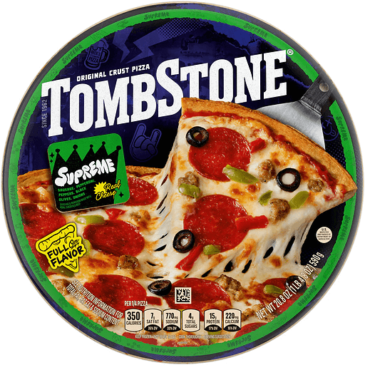 Sausage, pepperoni, peppers, black olives, onions. Sausage & pepperoni made with pork, chicken & beef. Full on flavor buttery, crispy crust, zesty sauce. Made with real cheese. Per 1/4 Pizza: 340 calories; 7 g sat fat (35% DV); 800 mg sodium (35% DV); 4 g total sugars; 15 g protein (17% DV); 210 mg calcium (25% DV). See nutrition information for total fat, sat fat & sodium content. US inspected and passed by Department of Agriculture. Since 1962. Thoughtful Portion: 1 portion = 1/4 of pizza a perfect combination is one portion, a fresh salad and great company. Good food, good life. Nestle. Nutritional compass. SmartLabel: Scan for more info. Good to Connect: Tombstonepizza.com. Call or text us at 1-800-558-7343. Please have package available when you call.