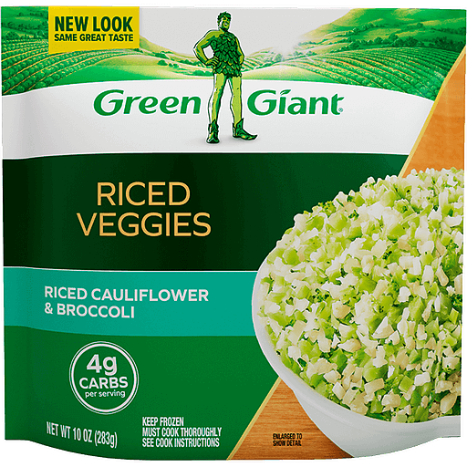 Green Giant Riced Veggies Cauliflower & Broccoli has the feel of one of your favorite side dishes, but with a frozen veggie, cauliflower twist. Made with 100% vegetables, these riced vegetables are a delicious dinnertime side dish and a unique alternative to white rice. These Green Giant frozen vegetables come without sauce or seasoning so you can prepare them how you want or pair them with a variety of entrees. These frozen Riced Veggies have 4 grams of carbs per serving and are gluten free. Serve these riced veggies as an alternative to rice, potatoes and pasta at any lunch or dinner. To prepare this Riced Cauliflower & Broccoli, simply follow the cooking instructions and heat in the microwave or on the stovetop. Keep Green Giant frozen riced Cauliflower & Broccoli in the freezer until you are ready to prepare and serve. 80% fewer calories than the leading brand of prepared white rice