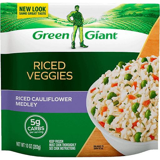 This Green Giant Riced Veggies Cauliflower Medley has the feel of one of your favorite side dishes, but with a frozen veggie, cauliflower twist. Made with 100% vegetables, these riced vegetables are a delicious dinnertime side dish and a unique alternative to white rice. These Green Giant frozen vegetables come without sauce or seasoning so you can prepare them how you want or pair them with a variety of entrees. These frozen Riced Veggies have 5 grams of carbs per serving and are gluten free. Serve this riced veggie medley as an alternative to rice, potatoes and pasta at any lunch or dinner. To prepare this cauliflower riced medley, simply follow the cooking instructions and heat in the microwave or on the stovetop. Keep Green Giant frozen riced cauliflower medley in the freezer until you are ready to prepare and serve. 80% fewer calories than the leading brand of prepared white rice.