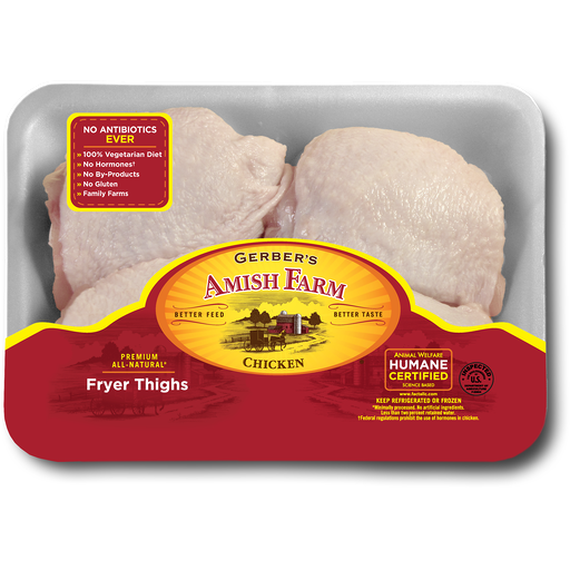 Weekly Ad Digital Coupons Curbside Pickup Favorites FAQs ⓘ Gerbers Amish Chicken ThighsFOOD SAFETY: Produced in a facility that also processes Soy, Wheat, Milk, Eggs, Tree Nuts, Peanuts, Fish, and Shellfish. Keep refrigerated at or below 41F. Cook to 165F internal temperature.