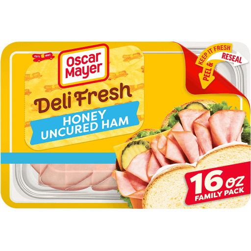 Make a delicious deli sandwich at home with Oscar Mayer Deli Fresh Honey Uncured Ham Contains Up to 24% of Seasoning Solution, Browned with Caramel Color Sliced Lunch Meat. Our quality honey ham deli meat is 97% fat free and made with no artificial preservatives*, no added hormones and no nitrates or nitrites added. *See back panel for ingredients to support quality. Fully cooked and ready to eat, our uncured ham slices have a mouthwatering sweet flavor with a touch of honey that's perfect for a sandwich, cheese and crackers, or salads. Keep our family sized 16-ounce package of deli ham refrigerated to maintain freshness. If you enjoy our honey deli ham, be sure to try the other varieties of Oscar Mayer ham lunch meat.