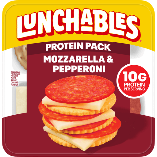Have fun with lunch! Lunchables Mozzarella & Pepperoni Protein Pack lets kids eat it their way — no prep needed! Each 2.25-ounce pack contains mozzarella pasteurized prepared cheese product and pepperoni that are perfectly paired with buttery, flaky crackers featuring the perfect combo of salty and sweet flavor. Meat used in our delicious pepperoni is made with 100% pork without BHAs or BHTs. Packed with protein and fun in every bite, each serving contains 10 grams of protein. Our Lunchables kit tastes great and is perfect as part of school lunches, weekend bites or any time hunger strikes. The real win is that kids get to make it and eat it their way! Keep Lunchables refrigerated until you're ready to enjoy.