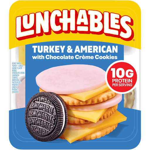 Have fun with lunch! Lunchables Turkey & American with Chocolate Creme Cookies lets kids eat it their way — no prep needed! Each 3.2-ounce pack contains cured roast white turkey, smoke flavor added and American pasteurized prepared cheese product that are perfectly paired with buttery, flaky crackers featuring the perfect combo of salty and sweet flavor. For a tasty treat, enjoy delicious chocolate sandwich cookies with smooth, velvety creme filling, crafted exclusively for our Lunchables kits. Packed with protein and fun in every bite, each serving contains 10 grams of protein. Our Lunchables kit tastes great and is perfect as part of school lunches, weekend bites or any time hunger strikes. The real win is that kids get to make it and eat it their way! Keep Lunchables refrigerated until you're ready to enjoy.