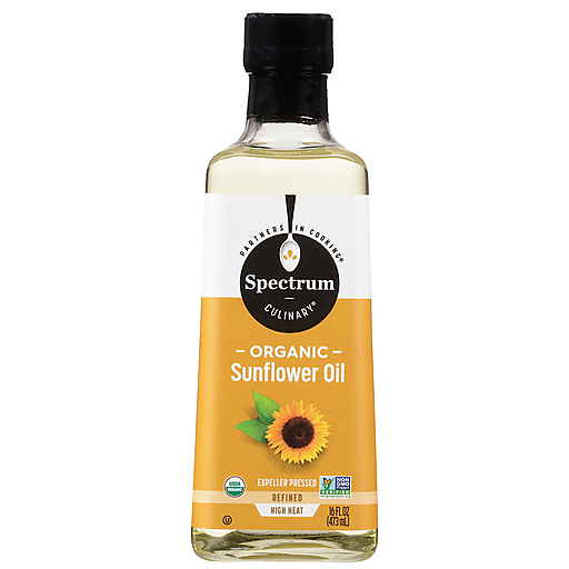 SPECTRUM NATURALS EXPELLER PRESSED SUNFLOWER OIL IS PERFECT FOR HIGH HEAT COOKING AS WELL AS BAKING. CERTIFIED KOSHER, NON-GMO, OUR OIL IS LOWER IN BOTH SATURATED AND POLYUNSATURATED FATS THAN REGULAR SUNFLOWER OILS. SPECTRUM SUNFLOWER OIL HAS A NEUTRAL FLAVOR AND A HIGH "SMOKE POINT" THAT LENDS ITSELF TO ALL-PURPOSE COOKING AND BAKING. INCLUDES ONE 16 OZ. BOTTLE OF CHOLESTEROL AND TRANS-FAT FREE SPECTRUM NATURALS EXPELLER PRESSED SUNFLOWER OIL.