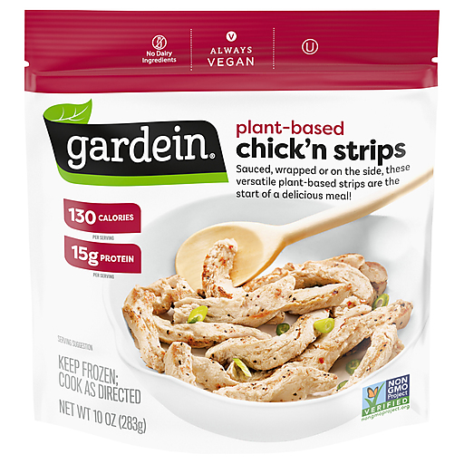 Discover how delicious meatless can be with Gardein Plant-Based Chick'n Strips. Succulent and savory, these frozen meatless alternatives to chicken strips offer a satisfying taste and texture. They are sure to become the star of any meal. This plant based vegetarian chicken alternative is Kosher, certified vegan, Non-GMO Project Verified and made with no dairy ingredients for a vegetarian food that fits your lifestyle. With 15 grams of protein per serving, meatless frozen strips are a tasty vegan protein option. Easy to make, this vegan food can be added to your favorite recipes. Simply follow the instructions on the package for delicious vegan and vegetarian meals. Store this convenient frozen food in your freezer until you're ready to enjoy it. Your favorite foods made meatless. Discover tasty frozen entrees, appetizers and more. Gardein makes delicious meatless foods that make skipping meat easy without skipping your favorite foods.