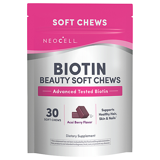 NeoCell Biotin Beauty Soft Chews promote beautiful skin, healthy hair and nails, and energy support (1) in a convenient soft chew. These acai berry flavored soft chews deliver biotin, one of the B vitamins that supports healthy hair and nails (1). By supporting the metabolism of proteins in the body, these womens vitamins also create natural energy (1). IGEN Non-GMO tested (2), this skin and hair care supplement is gluten-free and contains no soy, wheat, or lactose. Simply take one soft chew biotin supplement each day as part of your hair products and skin care routine, and unleash your most beautiful you.