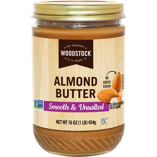 WOODSTOCK SMOOTH DRY ROASTED ALMOND BUTTER IS A YUMMY NUT BUTTER YOU CAN FEEL GOOD ABOUT EATING. USE IT TO REPLACE PEANUT BUTTER IN YOUR FAVORITE RECIPES, SLATHER IT ON BREAD AS PART OF A PB & J SANDWICH, OR SPREAD IT ON CELERY STICKS FOR A HEALTHY AND FLAVORFUL SNACK. WE MAKE THE ALMOND BUTTER IN THIS 16 OZ. JAR WITH DRY-ROASTED UNBLANCHED ALMONDS AND ADD NO OTHER INGREDIENTS, SO YOU GET TRUE ALMOND FLAVOR IN EVERY SPOONFUL.