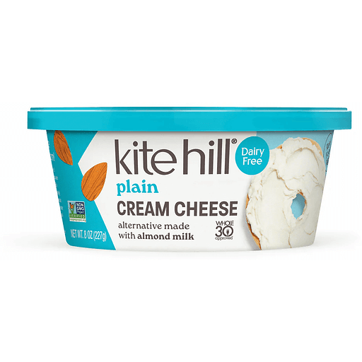 Alternative made with almond milk. Almond milk cream cheese alternative. No artificial flavors or preservatives. Dairy free. Dairy free, soy free, gluten free, vegan. Non GMO. Non GMO Project verified. nongmoproject.org. Our dairy free cream cheese alternative is velvety smooth, with a rich, subtly sweet flavor. Plant-based artisans. Kite Hill was founded by an artisan chef, and you can tell in every delicious bite. Our cream cheese style spread is crafted with cultured almond milk for a truly mouth-watering experience. Eating plant-based foods feels great and the taste is irresistible. Made from live cultures. kite-hill.com. (at)kitehillfoods. BPA free.