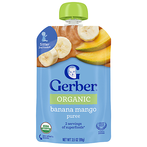 Our Gerber Organic Banana Mango Puree Pouch is crafted with wholesome ingredients, making it a premium choice for your little one. This fruit puree pouch has 45% of the daily value of vitamin C, 35% of the daily value of potassium and two servings* of superfoods. These stage 2 Gerber baby food pouches are designed for babies who are ready to explore new textures and flavors, making them a great addition to your baby's diet. Gerber baby food understands the importance of providing wholesome food as your baby grows and develops. Our Gerber baby food fruit puree is ideal for parents who seek quality in their baby's diet.