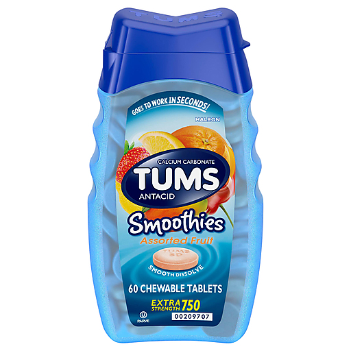 TUMS Smoothies Chewable Extra Strength Antacid Tablets are an extra strength antacid that works in seconds, so you can forget your heartburn and get back to the moments that matter. TUMS extra strength chewable antacid tablets contain 750 mg of calcium carbonate to quickly and effectively fight heartburn and relieve sour stomach, acid indigestion and upset stomach associated with these symptoms. These smooth tasting and delicious fruit flavored antacid tablets neutralize acid on contact, giving you fast extra strength heartburn relief. Adults and children 12 years and older may chew two to four antacid chewable tablets as symptoms occur or as directed by a doctor. Known as a trusted brand to fight heartburn fast for 90 years, TUMS is America's #1 antacid and the #1 physician, pharmacist and OBGYN-recommended adult antacid brand. These TUMS antacid tablets come in a resealable bottle that is easy to take on the go in a purse or pocket so you're ready when heartburn strikes.