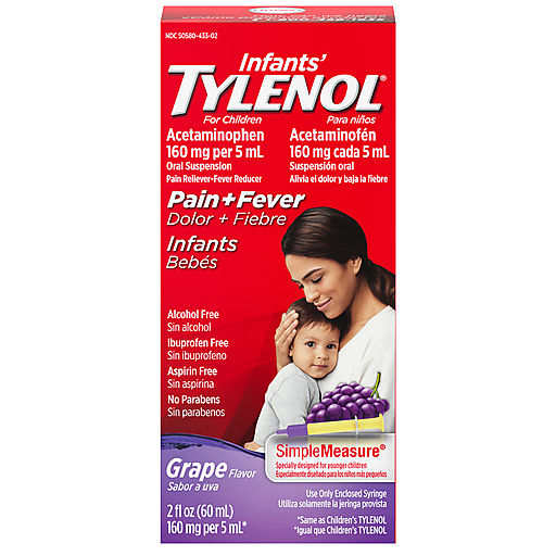 Infants' Tylenol Oral Suspension provides temporary pain relief from your child's minor aches and pains due to the common cold, flu, sore throat, headache, toothache. This liquid medicine is also formulated to temporarily reduce fever and starts working to relieve symptoms in as little as 15 minutes. Each 5-milliliter dose contains 160 milligrams of acetaminophen, a known pain reliever and fever reducer. Infants' Tylenol is the #1 pediatrician-recommended brand for infant teething pain, is ibuprofen-, aspirin- and alcohol-free, and is gentle on little tummies with a kid-friendly grape flavor. It includes a SimpleMeasure syringe with dosing for children 2 to 3 years of age. For dosing information for children under 2 years, ask your healthcare professional. Help provide relief for your infant with Tylenol, the #1 pediatrician-recommended brand of pain reliever and fever reducer.