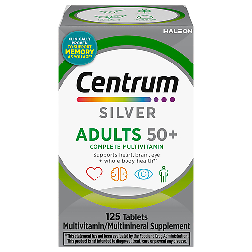 Centrum Silver Multivitamin for Adults 50 Plus brings you a tailored senior multivitamin/multimineral supplement to help support full body wellness (1). This multivitamin contains essential nutrients, including Vitamin D and calcium to help support strong bones, B Vitamins to help promote heart health, zinc to help support normal brain function, and lutein and Vitamins A, C, and E to help support healthy eyes (1, 2, 3). Key nutrients in these multivitamins help fill in nutritional gaps to promote overall wellness and vitality (1). This multivitamin for men and women is verified Non-GMO (3) and gluten free to appeal to a variety of dietary preferences. These tablets feature a smooth coating that makes these adult vitamins easy to swallow. Simply take one of these vitamin supplements daily to provide your body with essential vitamins and minerals. Help support full body wellness (1) with Centrum multivitamins for adults 50 and older, the #1 doctor and pharmacist recommended brand.