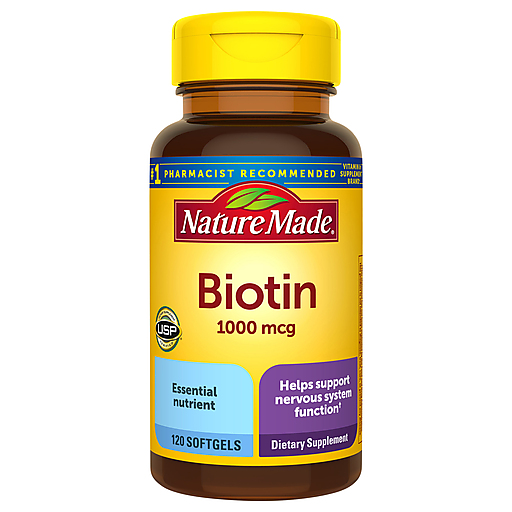 Nature Made Biotin 1000 mcg is a dietary supplement that supports healthy hair and skin health. Sourced from carefully selected high-quality ingredients, these Biotin softgels have no synthetic dyes, no artificial flavors, and are gluten free. Biotin, also known as Vitamin B7, is an essential nutrient that also helps support energy metabolism(1). This Biotin supplement is formulated for people looking to support their Biotin intake. Adults, take one Nature Made 1000 mcg gluten free Biotin softgel daily with water and a meal. Nature Made supplements are quality you can trust. USP has tested and verified ingredients, potency, and manufacturing process. USP sets official standards for dietary supplements. Visit the USP verified website for more information. (1)Helps convert food into cellular energy. *Based on a survey of pharmacists who recommend branded vitamins and supplements.