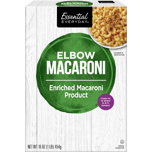 Enriched macaroni product. Cooks to al dente in 9-11 minutes. Per 1/2 Cup Dry: 200 calories; 0 g sat fat (0% DV); 0 mg sodium (0% DV); 2 g total sugars. Contents may settle. Product sold by weight not volume. Great products at a price you'll love that's Essential Everyday. Our goal is to provide the products your family wants, at a substantial savings versus comparable brands. We're so confident that you'll love Essential Everyday, we stand behind our products with a 100% satisfaction guarantee. 100% quality guaranteed. Like it or let use make it right. That's our quality promise. 877-932-7948. essentialeveryday.com. 100% recycled paperboard.