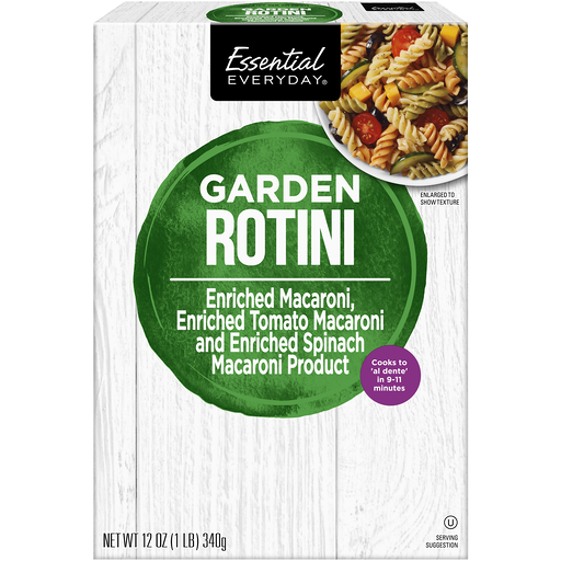 Enriched macaroni, enriched tomato macaroni and enriched spinach macaroni product. Cooks to al-dente in 9-11 minutes. Per 3/4 Cup Dry: 200 calories; 0 g sat fat (0% DV); 15 mg sodium (1% DV); 2 g total sugars. Contents may settle. Product sold by weight not volume. Great products. At a price you'll love that's Essential Everyday. Our goal is to provide the products your family wants, at a substantial savings versus comparable brands. We're so confident that you'll love Essential Everyday, we stand behind our products with a 100% satisfaction guarantee. For additional recipes, visit www.essentialeveryday.com. 100% Quality Guaranteed. Like it or let us make it right. That's our quality promise. 877-932-7948 essentialeveryday.com. 100% recycled paperboard.