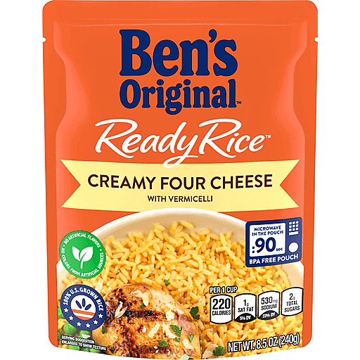 BEN'S ORIGINAL Ready Rice Creamy Four Cheese helps you enjoy delicious flavored rice in only 90 seconds. This microwave rice contains parboiled long grain rice, vermicelli pasta, and a savory combination of cheddar cheese, blue cheese, Romano cheese, and mozzarella cheese for a creamy rice side dish packed with flavor. This convenient parboiled rice comes in a BPA-free microwaveable pouch that eliminates prep and cleanup, making it the perfect choice for people with little time to cook or those who simply want a quick cooked rice meal. Place the rice pouch in the microwave and cook for 90 seconds, or empty the pouch into a skillets and heat until it is ready to serve. Great as a side dish or part of a main course, pair this cheese rice side with your favorite meats, use it to prepare tasty casseroles, or serve it on its own. BEN'S ORIGINAL Ready Rice Creamy Four Cheese Rice is vegetarian, contains no artificial flavors and no colors from artificial sources. BEN'S ORIGINAL is dedicated to creating meals and experiences that offer everyone a seat at the table.