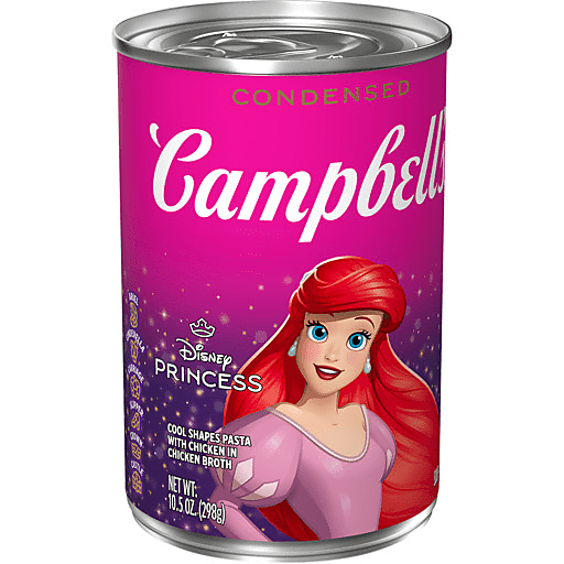 Make mealtime magical with a bowl of Campbell’s® Condensed Kids Soup, Disney® Princess Cool Shapes Pasta With Chicken in Chicken Broth. This enchanting chicken soup is crafted with savory chicken broth, tender chicken meat with no antibiotics, and Disney® Princess-themed pasta shapes – including Ariel, Cinderella, carriages, slippers, crowns, and castles. The result is a fun, kid-friendly alternative to traditional chicken noodle soup. Top this playful kids soup with Pepperidge Farm® Goldfish® Crackers, or pair it with a sandwich for something quick and easy. Our convenient canned soup is a year-round pantry staple and the perfect comfort food on a chilly day or when your kiddo’s feeling under the weather. Simply mix the condensed soup with 1 can of water and microwave on high for 2.5 to 3 minutes in a covered microwave-safe bowl, or heat in a pot on the stove, stirring occasionally. Each 10.5 oz recyclable can contains about 2.5 servings of microwave soup and features a non-BPA lining. In addition to Disney® Princess, Campbell’s® soup is available with other character-themed shapes, including Disney® Frozen and Paw Patrol®. Campbell’s® makes delicious soups in flavors your family knows and loves, with quality, farm-grown ingredients in every can. M’m! M’m! Good!®