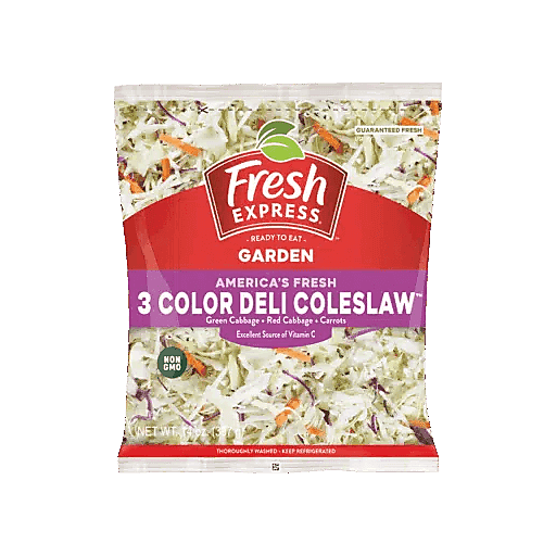 Green cabbage. Carrots. Red cabbage. America's fresh. Guaranteed fresh. Thoroughly washed. Ready to eat. No preservatives. 3-color deli cole slaw is an excellent source of vitamin C. vitamin C contributes to the reduction of fatigue, low fat diets rich in fruits and vegetables (foods that are low in fat and contain vitamin A, vitamin C and dietary fiber) may reduce the risk of some types of cancer, a disease associated with many factors. Fruits & veggies - more matters. To guarantee Fresh Express salads are consistently, deliciously fresh, we: Cool our salads within hours of harvest and keep them chilled from field to store; thoroughly rinse and gently dry then seal them in our Keep-Crisp bag to maintain freshness; and deliver fresh salads daily. Fresh Express Promise: Fresh guaranteed! At Fresh Express, we are passionate about delivering the freshest, highest quality salads possible! Our team of food scientists and agricultural experts are committed to exceeding industry standards so we can guarantee the freshness of our salads, every single day. Fruits & veggies - more matters.Questions? Comments? Call 1-800-242-5472 or visit www.FreshExpress.com. Product of USA.