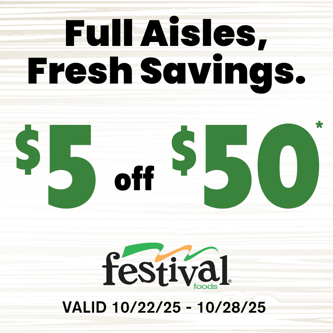 Save $5 on your next $50+ Festival Foods grocery purchase!